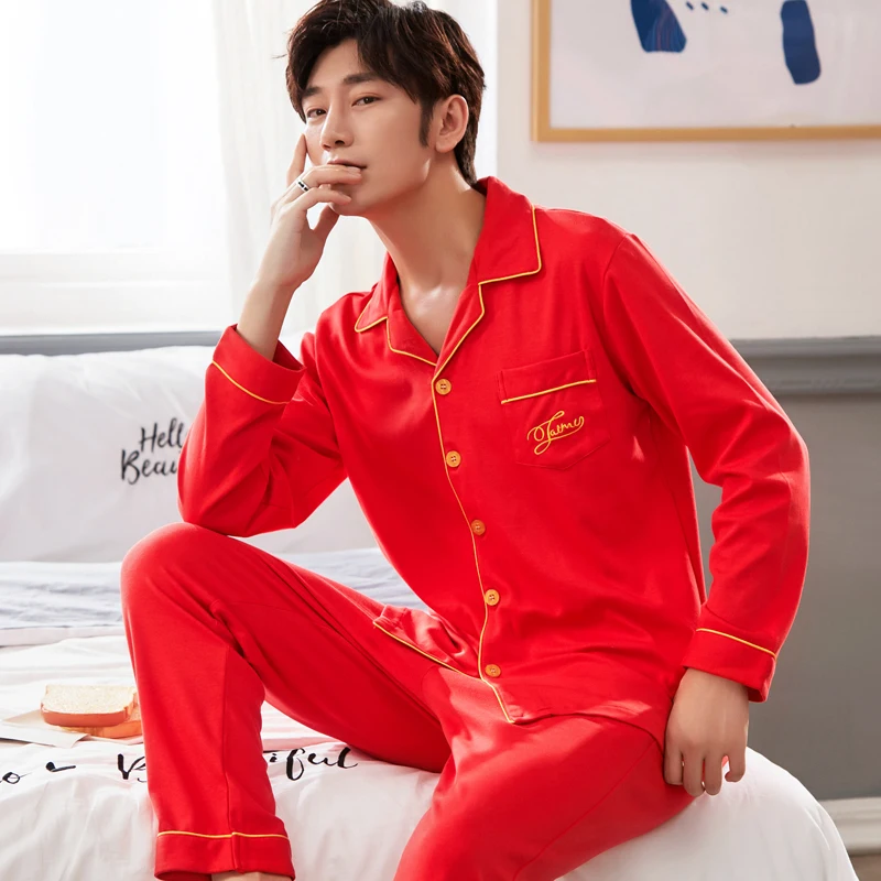 Addition Information of Autumn and winter men's long-sleeved pajamas set, all-cotton comfortable and breathable wedding red pajamas