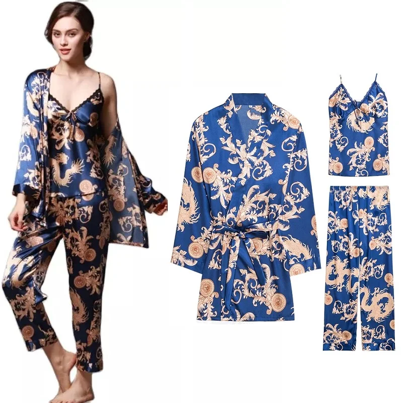 Addition Information of Ice Silk Nightdress Female Three Piece suit Summer Thin Loose Long Sleeved High End Imitation Silk Pajamas Dress Home Service