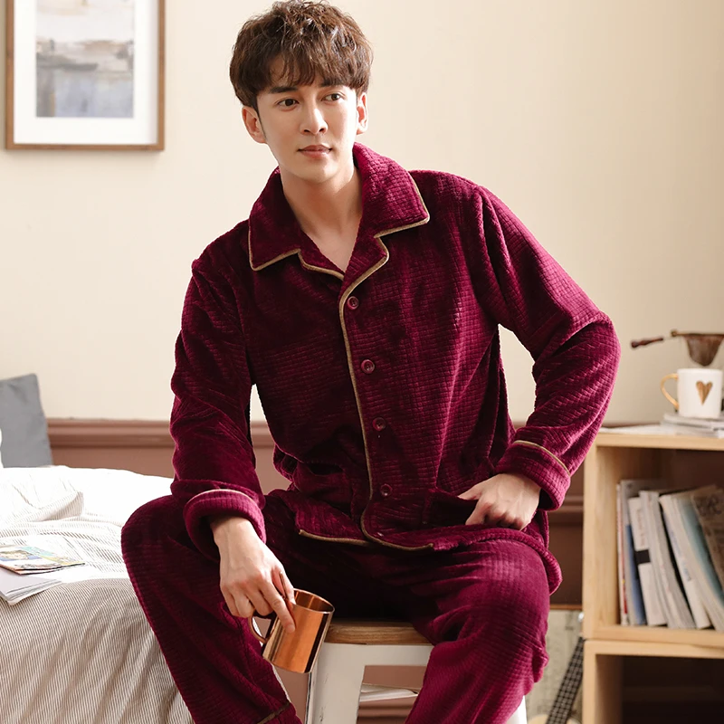 Winter Male Thickening Flannel Lounge Long-sleeve Coral Fleece Sleepwear Plus Size Wedding red festive cardigan pijamas hombre