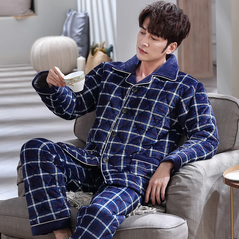 Men Pajama Set Pyjamas Suits Winter Three-layer Quilted Thick Full Cotton Warm Sleepwear Night Suit 3XL Men Nightwear Loungewear